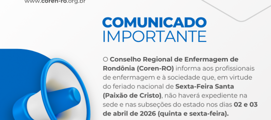 O Conselho Regional de Enfermagem de Rondônia (Coren-RO) informa ao público, aos profissionais de enfermagem e à sociedade em geral que o atendimento presencial em sua sede, em Porto Velho, será suspenso no dia 31 de março, terça-feira, no período das 13h às 17h. A interrupção temporária das atividades ocorre em virtude da realização de uma agenda interna administrativa com o corpo funcional da autarquia. O atendimento será retomado regularmente na quarta-feira (1) às 8h.