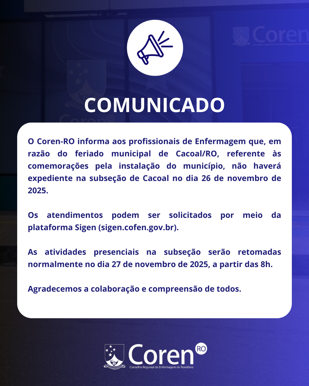 O Coren-RO informa aos profissionais de Enfermagem que, em razão do feriado municipal de Cacoal/RO, referente às comemorações pela instalação do município, não haverá expediente na subseção de Cacoal no dia 26 de novembro de 2025.