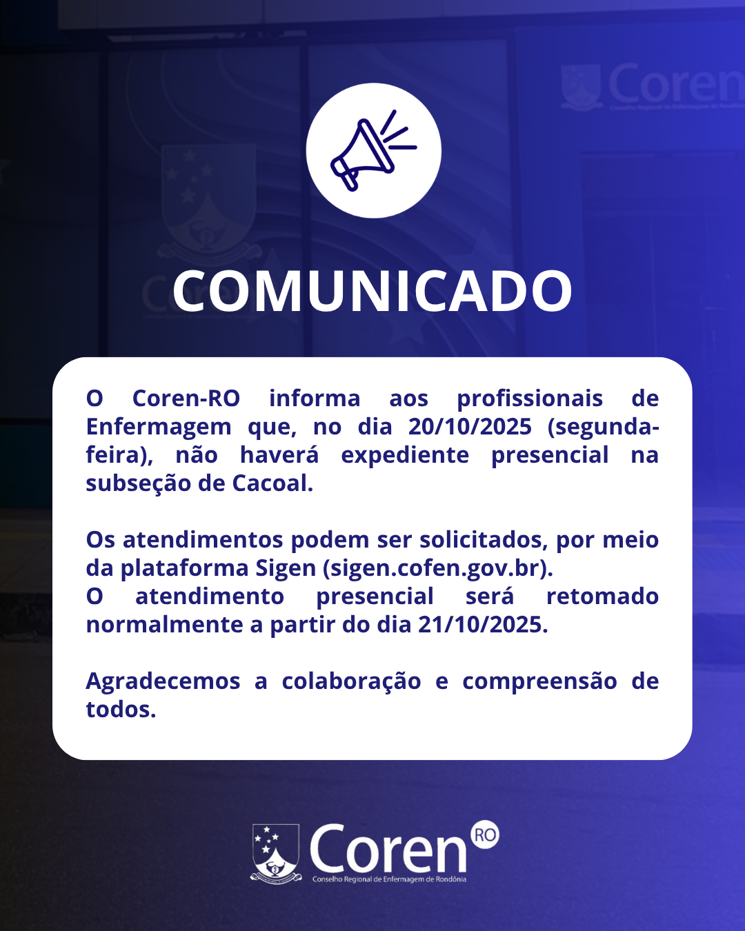 O Coren-RO informa aos profissionais de Enfermagem que, no dia 20/10/2025 (segunda-feira), não haverá expediente presencial na subseção de Cacoal. Os atendimentos podem ser solicitados, por meio da plataforma Sigen (sigen.cofen.gov.br). O atendimento presencial será retomado normalmente a partir do dia 21/10/2025.