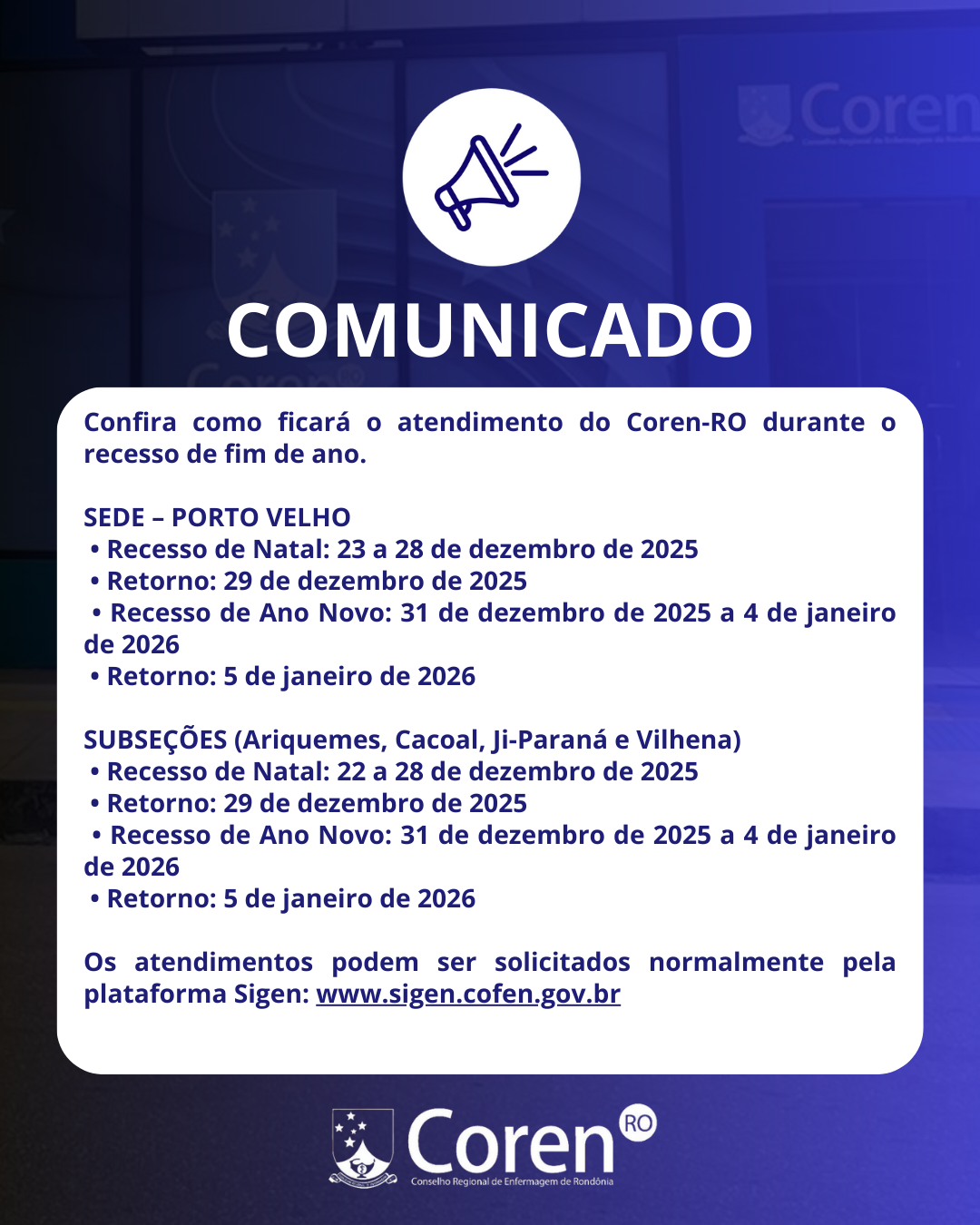 O Conselho Regional de Enfermagem de Rondônia (Coren-RO) informa aos profissionais e à comunidade que, em razão dos recessos de fim de ano, os horários de atendimento da Sede, em Porto Velho, e das subseções terão alterações entre os dias 22 de dezembro de 2025 e 4 de janeiro de 2026.