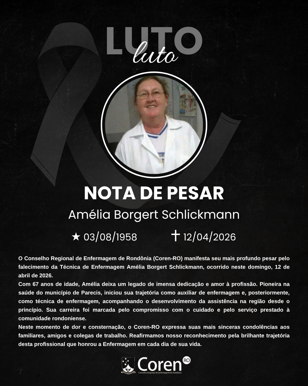 O Conselho Regional de Enfermagem de Rondônia (Coren-RO) manifesta seu mais profundo pesar pelo falecimento da técnica de enfermagem Amélia Borgert Schlickmann, ocorrido neste domingo, 12 de abril de 2026. Com 67 anos de idade, Amélia deixa um legado de imensa dedicação e amor à profissão. Pioneira na saúde do município de Parecis, iniciou sua trajetória como auxiliar de enfermagem e, posteriormente, como técnica de enfermagem, acompanhando o desenvolvimento da assistência na região desde o princípio. Sua carreira foi marcada pelo compromisso com o cuidado e pelo serviço prestado à comunidade rondoniense. Neste momento de dor e consternação, o Coren-RO expressa suas mais sinceras condolências aos familiares, amigos e colegas de trabalho. Reafirmamos nosso reconhecimento pela brilhante trajetória desta profissional que honrou a Enfermagem em cada dia de sua vida.