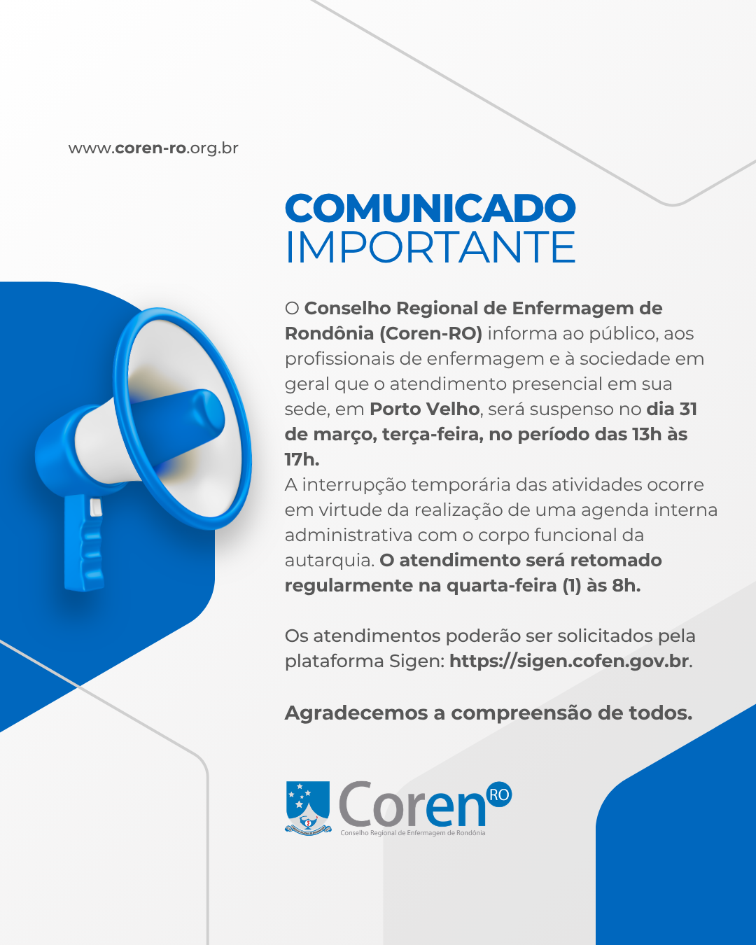 O Conselho Regional de Enfermagem de Rondônia (Coren-RO) informa ao público, aos profissionais de enfermagem e à sociedade em geral que o atendimento presencial em sua sede, em Porto Velho, será suspenso no dia 31 de março, terça-feira, no período das 13h às 17h. A interrupção temporária das atividades ocorre em virtude da realização de uma agenda interna administrativa com o corpo funcional da autarquia. O atendimento será retomado regularmente na quarta-feira (1) às 8h.