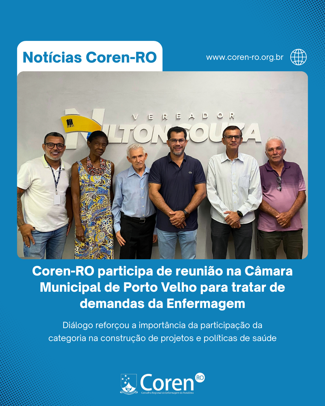 “O Coren-RO entende que a valorização da Enfermagem passa, necessariamente, pela participação ativa nos espaços de decisão. Estar próximo do Legislativo Municipal é fundamental para defender pautas como jornada de trabalho justa, plano de carreira, autonomia profissional e reconhecimento da importância da Enfermagem para o fortalecimento do Sistema Único de Saúde. Esse diálogo com o vereador Nilton Souza é um passo importante para avançarmos em políticas públicas que beneficiem tanto os profissionais quanto a população de Porto Velho”, destacou o Coren-RO, representado pelo presidente Josué Sicsú.