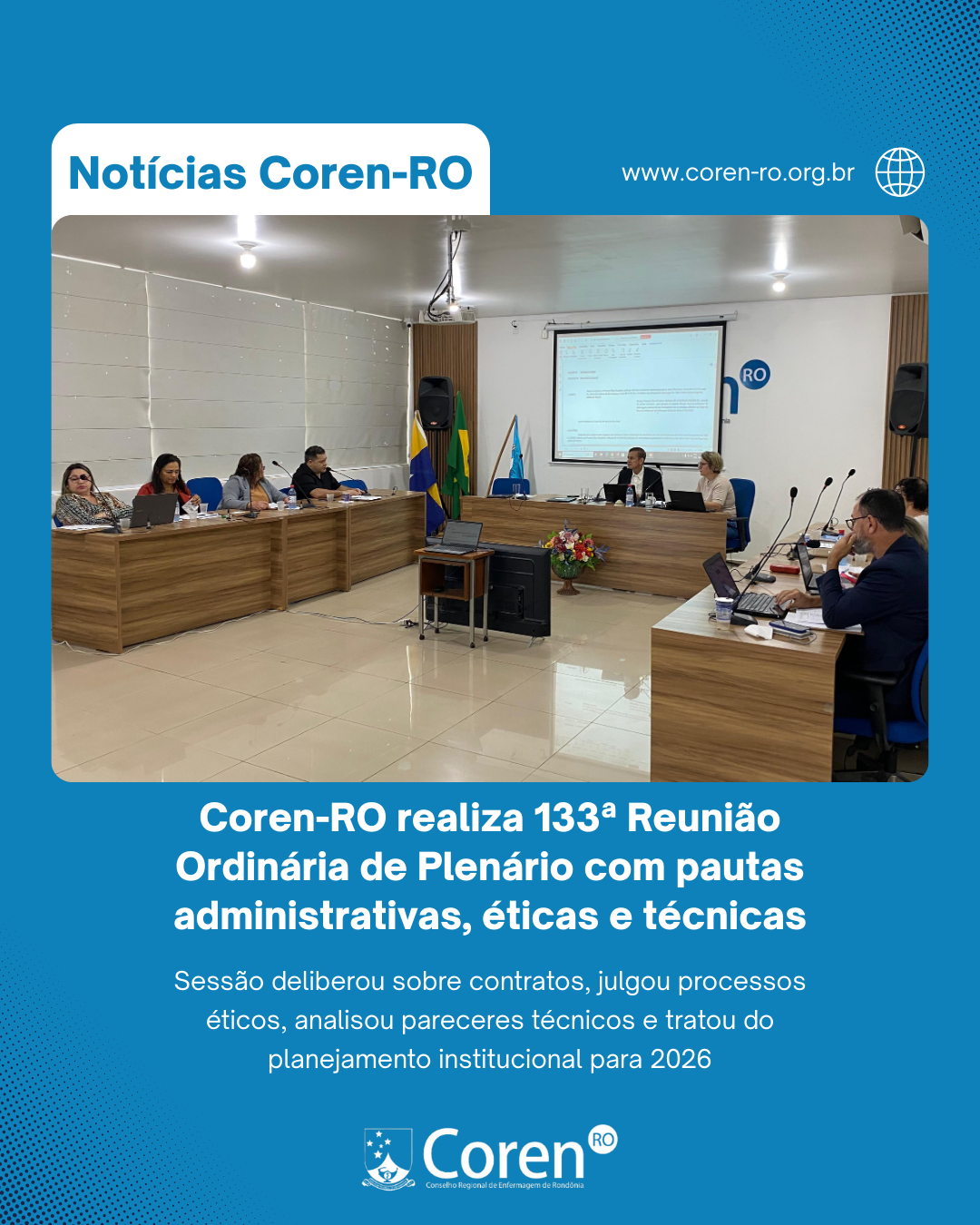 O Conselho Regional de Enfermagem de Rondônia (Coren-RO) realizou, na sexta-feira (30), a 133ª Reunião Ordinária de Plenário (ROP), reunindo conselheiros para apreciação de matérias administrativas, éticas e técnicas de interesse da Enfermagem rondoniense.
