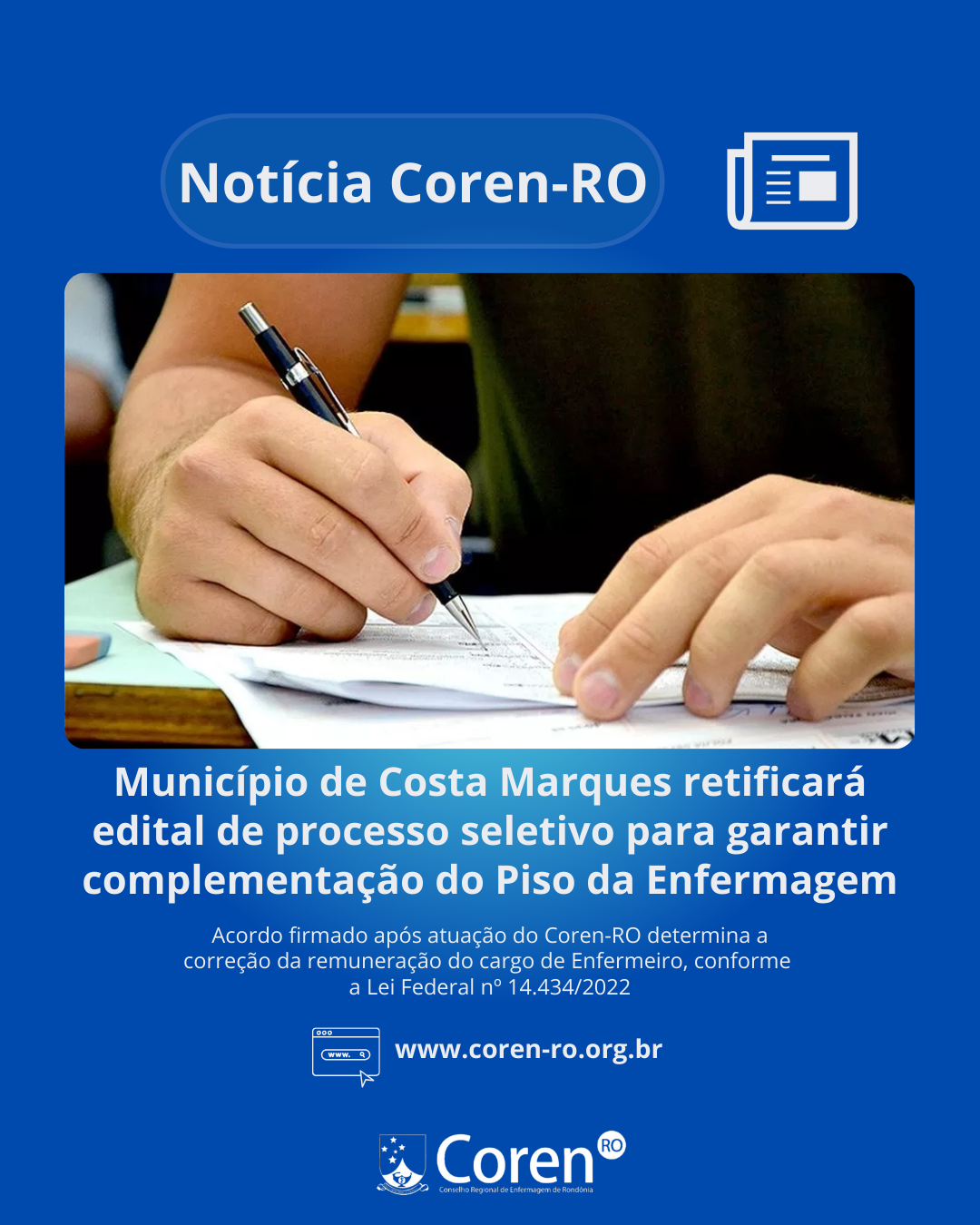O Conselho Regional de Enfermagem de Rondônia informa que o Município de Costa Marques promoverá a retificação do Edital de Teste Seletivo nº 001/SEMAD/2025, que inicialmente não havia observado a complementação do piso salarial nacional da Enfermagem na remuneração prevista para o cargo de Enfermeiro. Após o ajuizamento da Reclamação Pré-Processual nº 1021773-64.2025.4.01.4100, proposta pelo Coren-RO, foi formalizado acordo com a municipalidade para corrigir a remuneração prevista no edital. O acordo estabelece a retificação do item 2.1 do edital, incluindo expressamente a complementação salarial conforme a Lei Federal nº 14.434/2022, garantindo que os profissionais selecionados recebam vencimento acrescido da complementação prevista no Piso Nacional da Enfermagem.