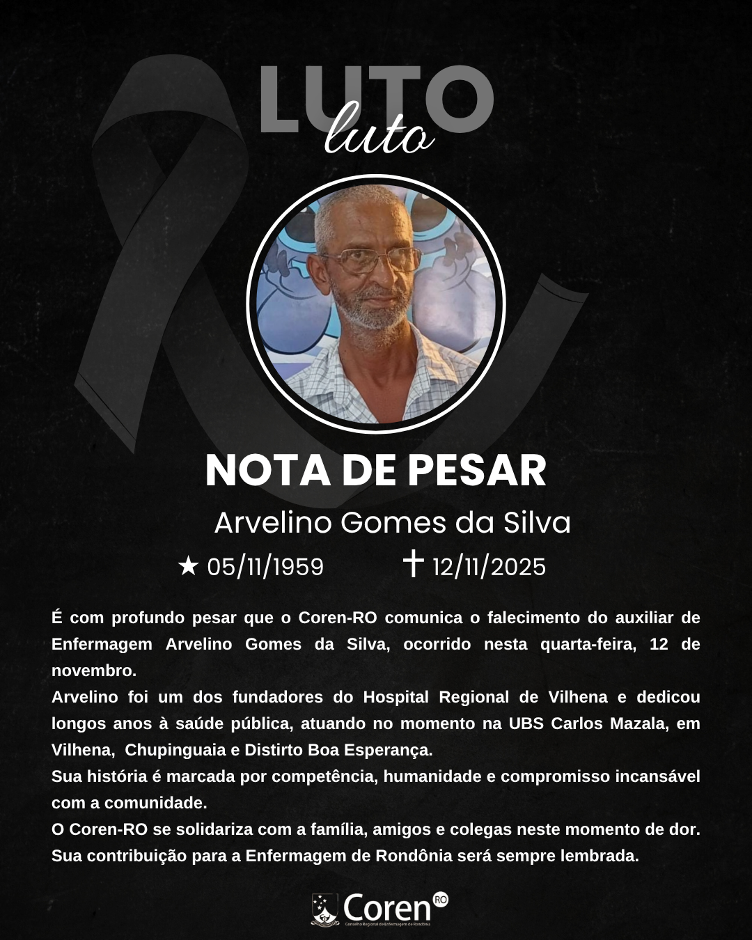 O Coren-RO se solidariza com a família, amigos e colegas de trabalho neste momento de dor, estendendo nossas sinceras condolências. A história e a contribuição de Arvelino Gomes da Silva para a Enfermagem e para a população de Vilhena e Chupinguaia jamais serão esquecidas.