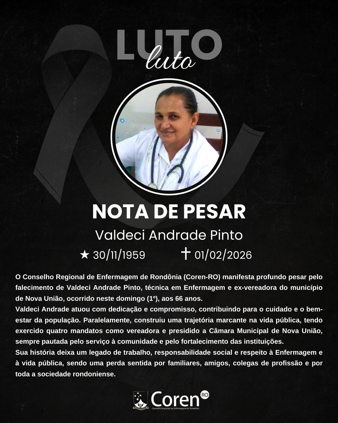 O Conselho Regional de Enfermagem de Rondônia (Coren-RO) manifesta profundo pesar pelo falecimento de Valdeci Andrade Pinto, técnica em Enfermagem e ex-vereadora do município de Nova União, ocorrido neste domingo (1º), aos 66 anos. Valdeci Andrade atuou com dedicação e compromisso, contribuindo para o cuidado e o bem-estar da população. Paralelamente, construiu uma trajetória marcante na vida pública, tendo exercido quatro mandatos como vereadora e presidido a Câmara Municipal de Nova União, sempre pautada pelo serviço à comunidade e pelo fortalecimento das instituições.