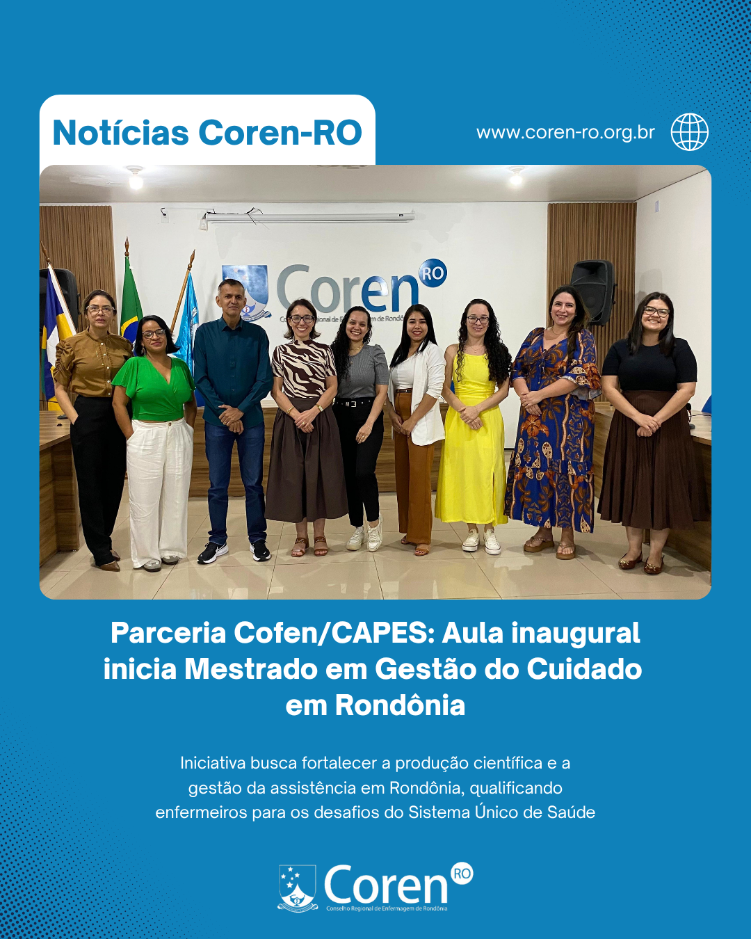 Teve início nesta segunda-feira (13/04), em Porto Velho, a primeira etapa de aulas da nova turma do Mestrado Profissional em Gestão do Cuidado em Enfermagem. O curso, viabilizado por meio do Acordo CAPES/Cofen, representa um marco histórico para a categoria em Rondônia, oferecendo formação de alto nível sem a necessidade de deslocamento dos profissionais para outros estados. A iniciativa, que também contempla o nível de Doutorado Profissional, teve seu processo seletivo realizado entre dezembro de 2025 e fevereiro de 2026. O objetivo central é a qualificação da prática assistencial, o aprimoramento da gestão do cuidado e o fortalecimento da produção científica diretamente alinhada às necessidades do Sistema Único de Saúde (SUS). Para o presidente do Coren-RO, Josué Sicsú, o início desta turma concretiza um compromisso da gestão com a ascensão intelectual e técnica dos enfermeiros rondonienses “O início desta turma de Mestrado é a realização de um projeto que prioriza o conhecimento como ferramenta de transformação. Ter mestres e doutores formados aqui, estudando a nossa realidade regional, é o que garante uma gestão em saúde mais eficiente e uma assistência segura. O Coren-RO se orgulha de ser o braço de apoio desse acordo entre CAPES e Cofen, trazendo para Rondônia o que há de mais avançado na produção científica da Enfermagem brasileira”, afirmou o presidente.