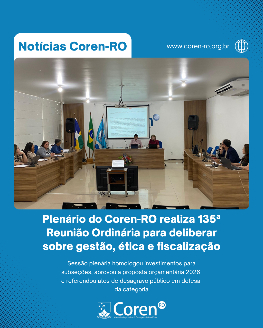 O Plenário do Conselho Regional de Enfermagem de Rondônia (Coren-RO) reuniu-se para a sua 135ª Reunião Ordinária de Plenário (ROP), com o objetivo de deliberar sobre pautas administrativas, éticas e técnicas de interesse da categoria. Durante a sessão, foram homologados contratos de infraestrutura, processos de inscrição profissional e analisados importantes pareceres técnicos que balizam a assistência em todo o estado. No âmbito administrativo, o Plenário homologou a contratação de serviço de internet por fibra óptica para a Subseção de Ji-Paraná, garantindo melhor suporte tecnológico para o atendimento aos profissionais da região central. Também foram aprovados o Relatório de Gestão 2025 e a Proposta Orçamentária para o exercício de 2026, assegurando o planejamento financeiro e a transparência da autarquia. A pauta ética ocupou lugar de destaque com a aprovação de pedidos de Desagravo Público em favor de profissionais que sofreram ofensas e desrespeito no exercício de suas funções em Porto Velho, Espigão D’Oeste e Theobroma. O presidente do Coren-RO, Josué Sicsú, enfatizou o rigor do Conselho diante de agressões à categoria “As decisões tomadas nesta sessão plenária, especialmente no que tange aos desagravos públicos, reafirmam que o Coren-RO não recuará diante de qualquer ato que fira a honra e a dignidade do profissional de Enfermagem. Seja em unidades de saúde, no sistema prisional ou em tribunas legislativas, exigimos respeito absoluto a quem dedica a vida ao cuidado. Nossa gestão segue vigilante para garantir que o exercício profissional seja realizado com segurança e valorização em todos os municípios de Rondônia.”, afirmou.