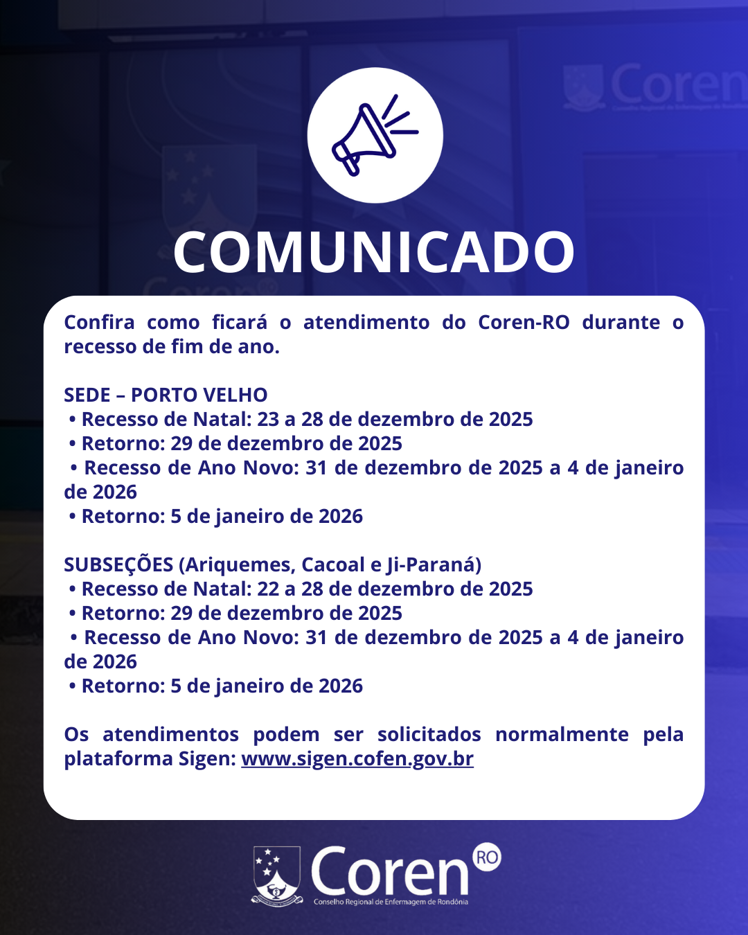 O Conselho Regional de Enfermagem de Rondônia (Coren-RO) informa aos profissionais e à comunidade que, em razão dos recessos de fim de ano, os horários de atendimento da Sede, em Porto Velho, e das subseções terão alterações entre os dias 22 de dezembro de 2025 e 4 de janeiro de 2026.