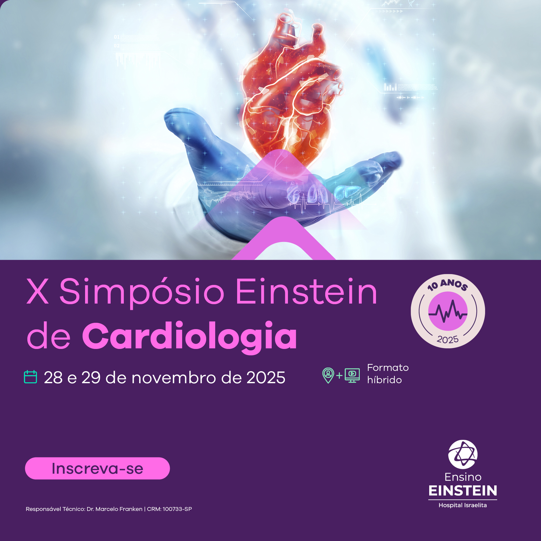 O tradicional Simpósio Einstein de Cardiologia chega à sua décima edição nos dias 28 e 29 de novembro de 2025, reunindo grandes nomes da cardiologia nacional e internacional. Promovido pelo Hospital Israelita Albert Einstein, o evento será realizado em formato híbrido — com atividades online e presenciais — e contará com discussões de casos clínicos, sessões científicas e o tradicional Year in Review, que abordará os principais estudos apresentados nos congressos internacionais. A programação contempla temas essenciais e atuais da prática cardiológica, como doença arterial coronária, valvopatias, insuficiência cardíaca, arritmias, transplantes cardíacos, cardiologia intervencionista, reabilitação cardiovascular, cardiologia do esporte, cardioncologia e o impacto da inteligência artificial na cardiologia moderna. O público-alvo inclui cardiologistas, residentes de cardiologia e clínica médica, médicos generalistas, estudantes de medicina, fisioterapeutas e enfermeiros especializados em cardiologia, proporcionando uma oportunidade única de atualização científica e troca de experiências.
